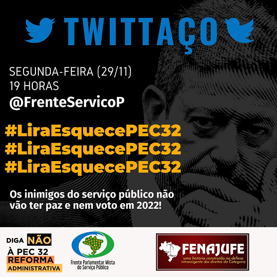A 12ª semana de mobilização permanente contra a reforma administrativa (PEC 32/20) e a PEC dos Precatórios (PEC 23/21) começa com tuitaço nesta segunda-feira (29), a partir das 19h, promovido pela Frente Parlamentar Mista do Serviço. A mobilização no Twitter conta com apoio da Fenajufe e diversas entidades parceiras. A hashtag de hoje é #LiraEsquecePEC32.