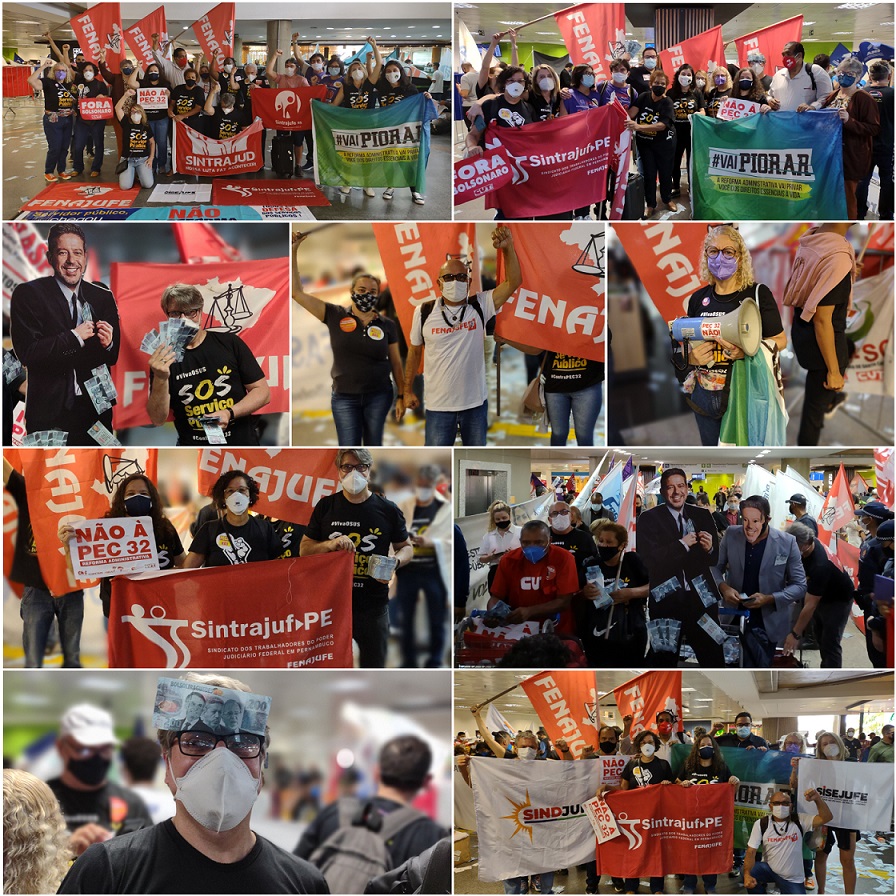 Em mais um dia de pressão e luta contra a reforma administrativa (PEC 32/20), servidoras e servidores de todo o País voltaram ao Aeroporto Internacional de Brasília e denunciaram a compra de votos para aprovar a reforma administrativa (PEC 32/20) – mais conhecida como a PEC da Rachadinha. É a sétima semana consecutiva de mobilização permanente em Brasília: Fenajufe, Sindicatos de base, entidades do Fonasefe e de diversos segmentos do funcionalismo em defesa dos serviços públicos.