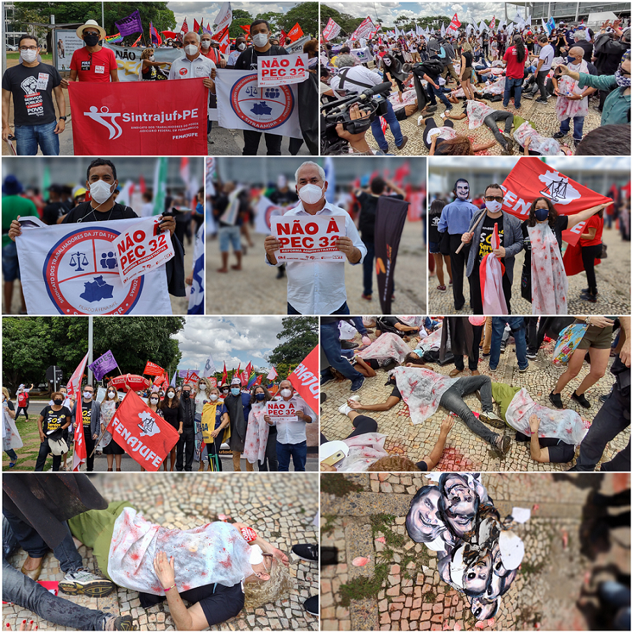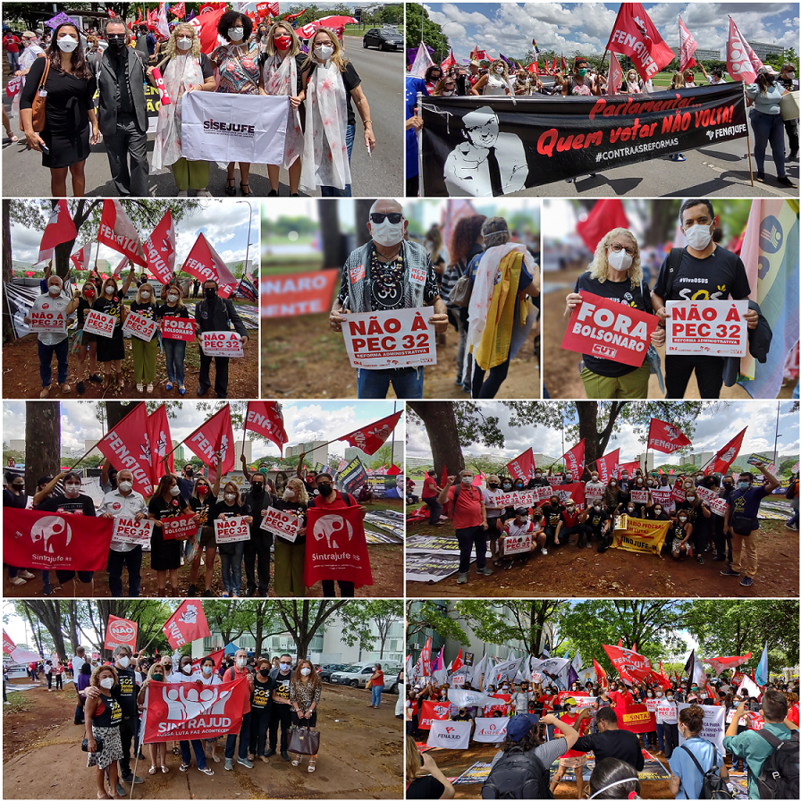 Em mais um dia de luta contra a reforma administrativa (PEC 32/20) nesta quarta-feira (20), servidoras e servidores ocuparam a Esplanada dos Ministérios e a Praça dos Três Poderes, em Brasília. A Fenajufe, Sindicatos de base, entidades do Fonasefe e de diversos segmentos do funcionalismo denunciaram o desmonte que a PEC 32 causará nos serviços públicos e o desprezo do governo Bolsonaro com a saúde dos brasileiros durante a pandemia de Covid-19 – resultando hoje em mais de 604 mil mortos pelo coronavírus.