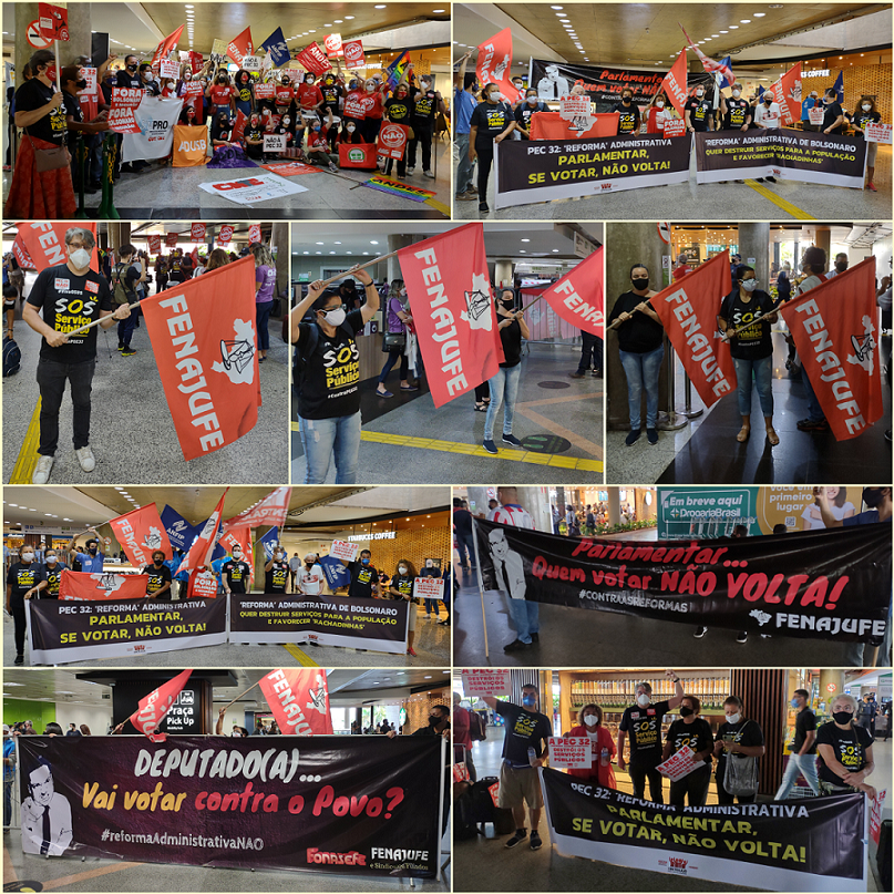 Continuando a luta contra a reforma administrativa (PEC 32/20), servidoras e servidores de todo o País marcaram presença no Aeroporto Internacional de Brasília nesta quarta-feira (13), pós-feriado, mobilizados contra a destruição do serviço público. O ato marca a quinta semana consecutiva de luta permanente contra a PEC 32.