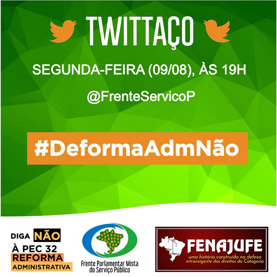 A semana de luta contra a reforma administrativa (PEC 32/20) começa com mais um tuitaço promovido pela Frente Parlamentar Mista do Serviço Público com apoio da Fenajufe e diversas entidades parceiras. A hashtag desta segunda-feira (9) é #DeformaAdmNão.