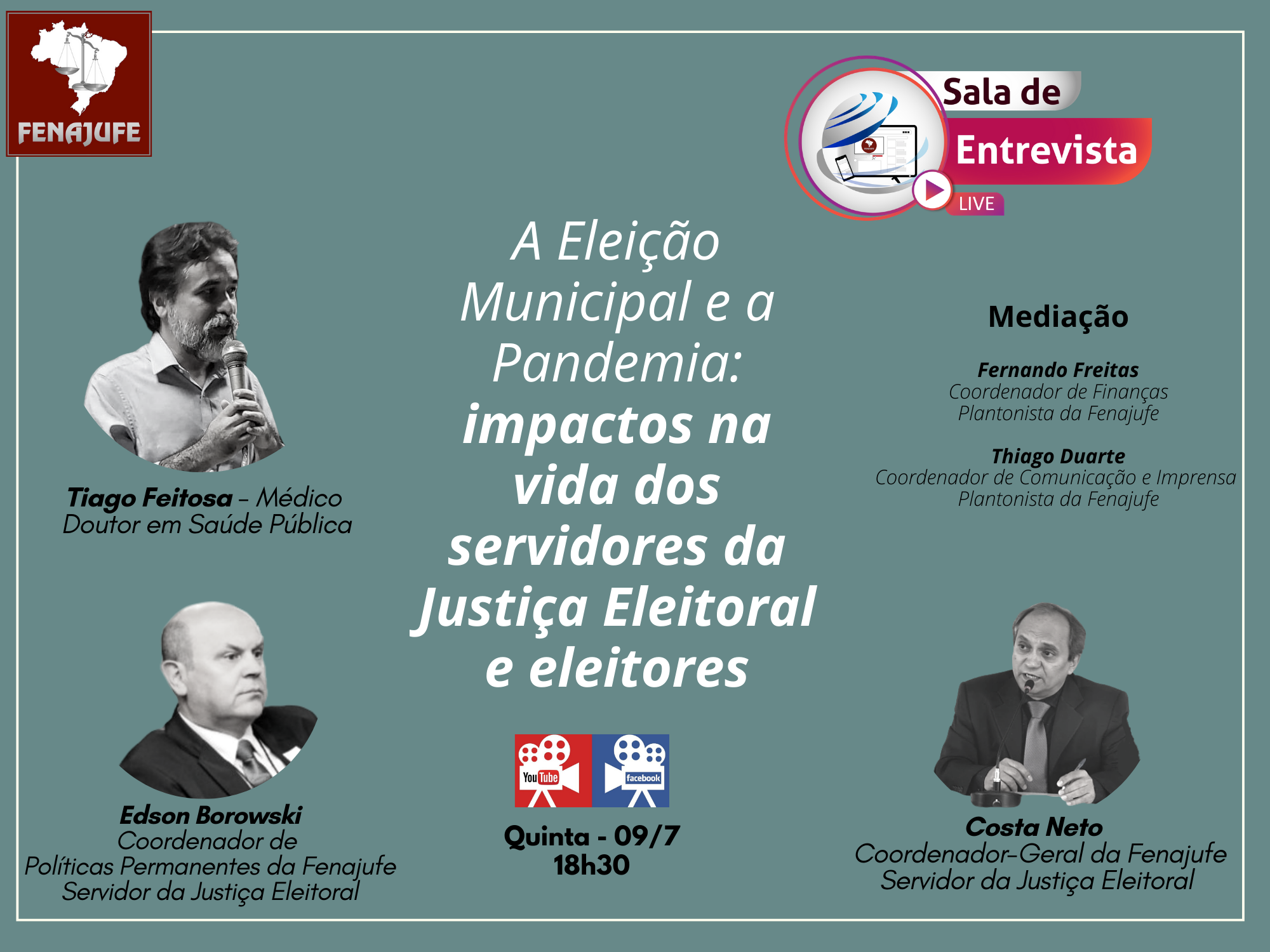 O Sala de Entrevista desta quinta-feira (9) debate os riscos da manutenção das eleições municipais de 2020 em meio à pandemia de Covid-19 que assola o Brasil. Com o tema “Eleição Municipal e a Pandemia: impactos na vida dos servidores da Justiça Eleitoral e eleitores”, os convidados são o médico e doutor em saúde pública Tiago Feitosa e os coordenadores da Fenajufe e servidores da Justiça Eleitoral Costa Neto e Edson Borowski.