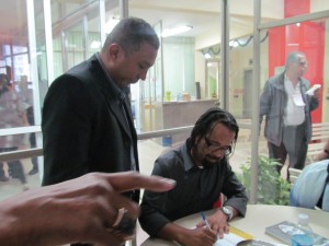 Sales Augusto dos Santos lançou o livro ‘Educação, um pensamento negro contemporâneo’ ao final do debate. Na foto ao lado, o sociólogo Sales Augusto dos Santos autografa seu livro para o coordenador geral do Sindjus/DF e da Fenajufe, Cledo de Oliveira Vieira.