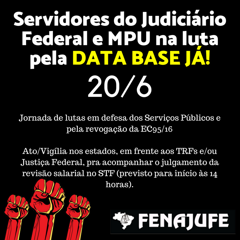 Nesta terça-feira (19/6) a partir das 10 horas a Esplanada dos Ministérios em Brasília receberá Servidores Púbicos de todo o país, em luta na defesa da data-base e da pauta salarial a ser negociada com o governo de Michel Temer. O ato, convocado pelo Fórum das Entidades Nacionais dos SPFs – Fonasefe – e pelo Fonacate – vai exigir do governo e do STF, posição em relação aos temas prioritários para os servidores.