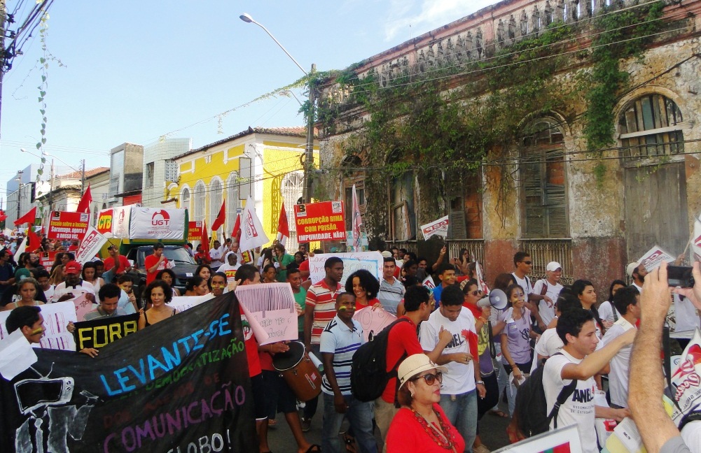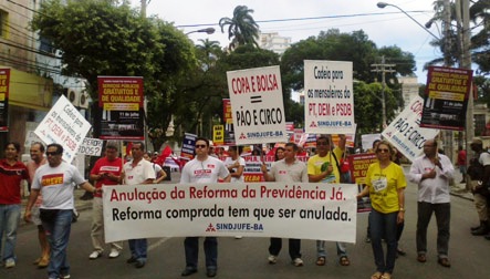 Sindjufe/BA – Os trabalhadores e estudantes fizeram uma grande passeata em Salvador, do Campo Grande até a Praça Municipal, onde participaram de uma audiência pública sobre mobilidade urbana. Em diversas vias de entrada da Cidade ocorreram bloqueios causando grandes congestionamentos. As bandeiras foram muitas, mas as principais cobravam 10% do PIB para a educação e o mesmo percentual para a saúde pública, o fim do fator previdenciário, o respeito ao direito de greve, reforma agrária, auditoria da dívida etc. Os servidores do Judiciário compareceram ao chamado do Sindjufe/BA e se uniram aos demais trabalhadores e estudantes levando as suas reivindicações por um serviço público gratuito e com qualidade, anulação da reforma da previdência, data-base para o servidor, redução da jornada e muitas outras. Em Feira de Santana e Vitória da Conquista também houve grande participação de rua com trabalhadores privados e públicos entoando palavras de ordem e muitas faixas em desaprovação à política econômica do Governo, corrupção, gastos com a Copa etc.