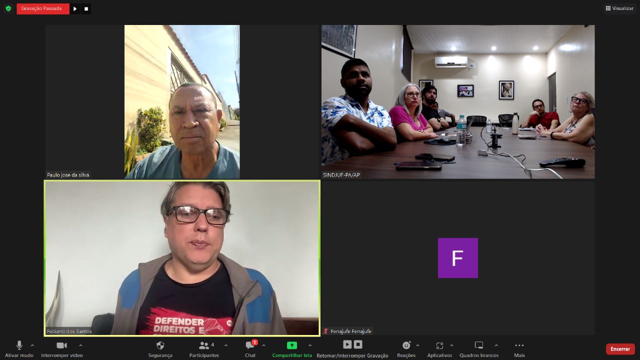 O Sindjuf-PA/AP ajudará a Fenajufe com a escolha da atração cultural e com o todo o suporte necessário para a realização do evento. Nesse encontro, os coordenadores Fabiano dos Santos e Paulo José da Silva participaram de forma virtual. Pelo Sindicato, participação das coordenadoras Nilce Figueira (Aposentada-TRT/8) e Mônica Genú (JF-PA), do assessor de coordenação, Fabrício Acácio, além da conselheira fiscal Alice Romana e do servidor do TRT8 Marcos Araújo.
